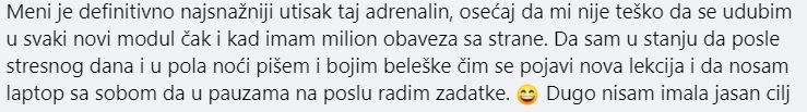 Ja sam tu tokom 3 meseca. I ne samo ja, već i Bobana, projektni menadžer i ostale polaznice. To je tek posebna priča - videćeš. Tu sam da razjasnim sve što nije jasno, da usmerim i pomognem, ali neću pisati prijave za posao umesto tebe, niti ću raditi zadatke umesto tebe. Tvoje je da delaš. 🙂 a za podršku ne beri brige. Ja sam u kontaktu i sa prvim polaznicima još iz 2016. godine. I nigde ne idem.